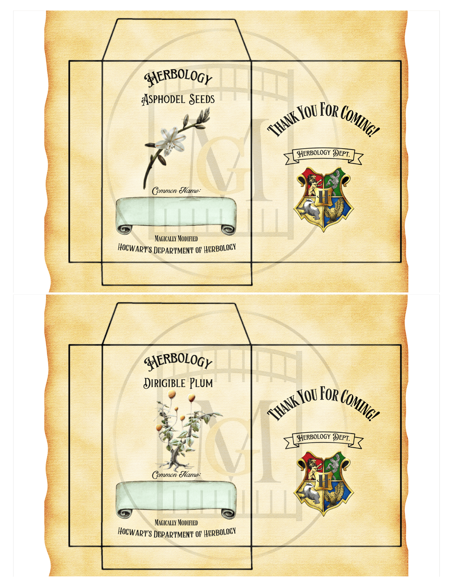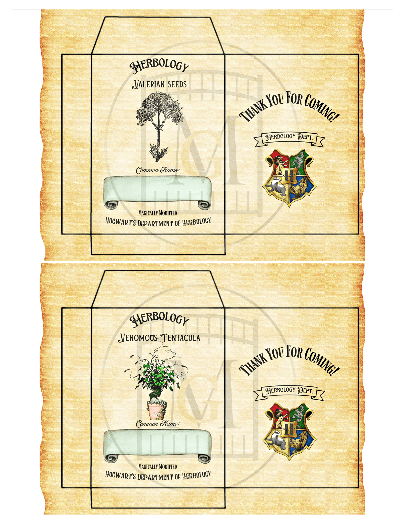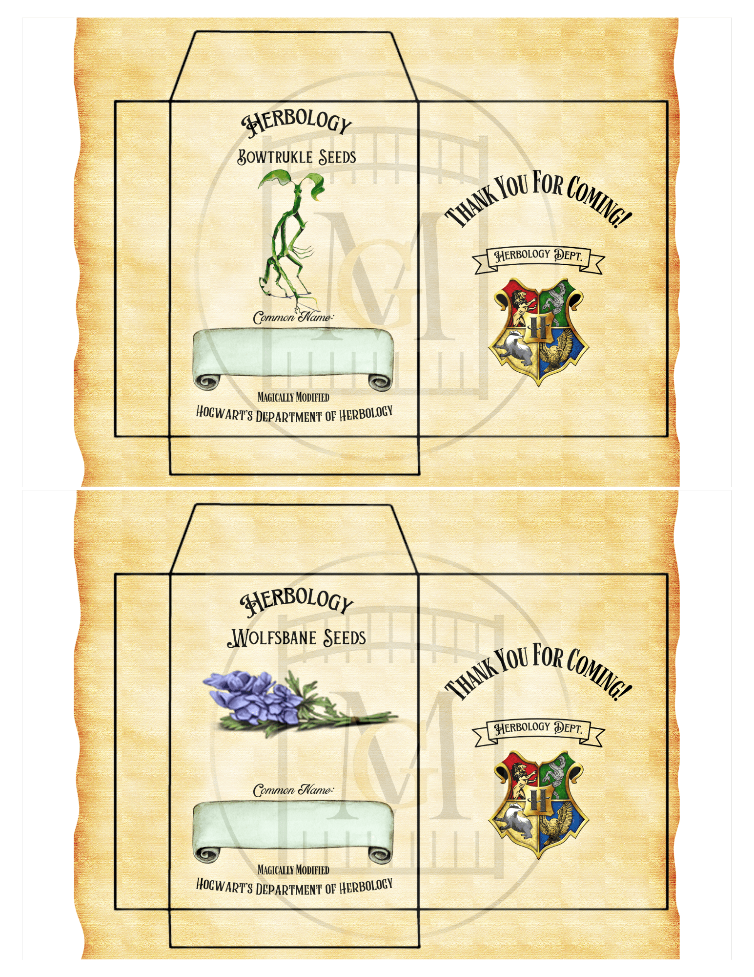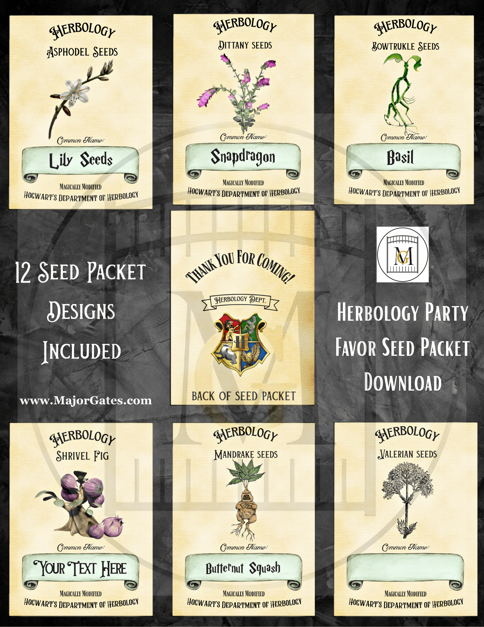 Get this Wizard HERBOLOGY Favor Seed labels download and give a fun gift to your guests for a Wizard themed party. This offering has 12 Hogwarts Herbology Seed Labels. Â You can edit the label with the common name of your choice for seeds that are available in your area. Â For example, choose seeds that grow well in your zone and enter the text or hand write in the common name area. Â Seed packets are 9.5cm long x 7cm wide.