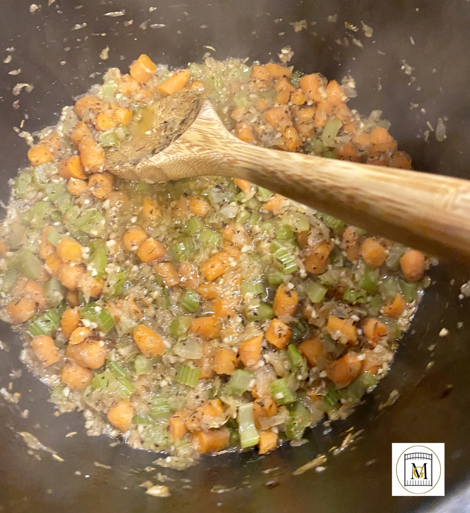 - Then add the diced onions, carrots, and celery.
